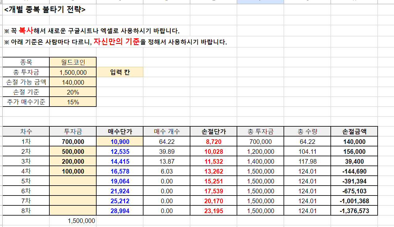 - (1차) 월드코인을 10,900원에 70만 원어치(약 64.22개)만큼 매수한다.